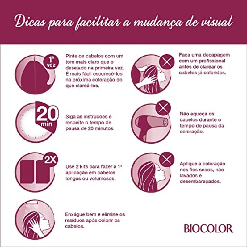 Tá pensando em dar aquele upgrade nos seus fios? Então você já pode ir pensando em uma das várias cores que a TINTURA BIOCOLOR CREME possui! Seus cabelos ficarão com uma cor linda e intensa, além de muito hidratada graças ao Complexo BIO5. Além disso, se você está sem tempo, isso não será um problema, porque em 20 minutinhos seus fios estarão deslumbrantes e com um fragrância suave, sem aquele cheiro forte de amônia.
