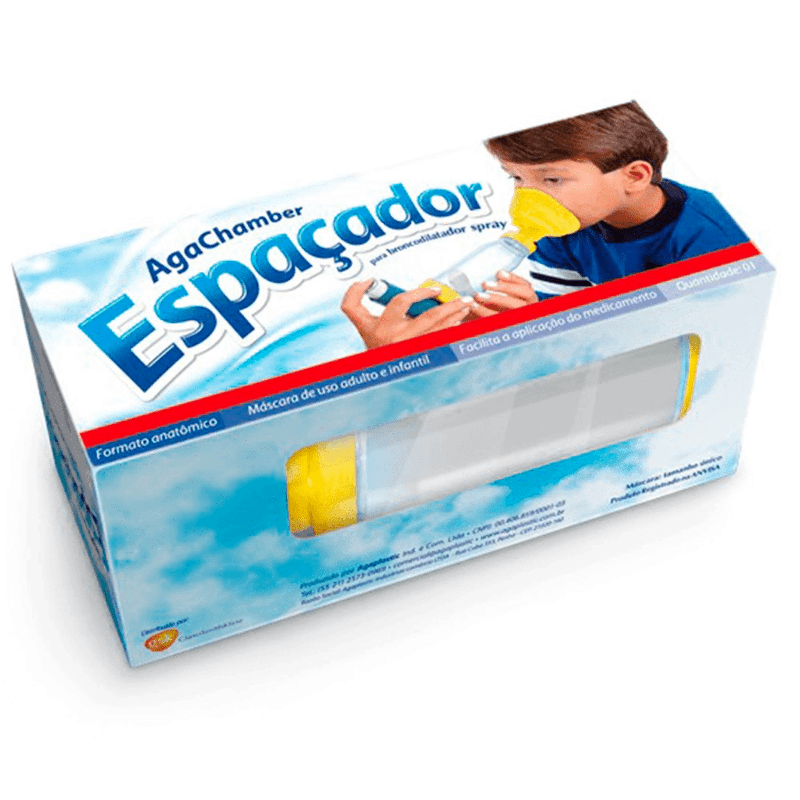 O Espaçador Agachamber Broncodilatador em formato anatômico é de uso adulto e infantil, vem acompanhado de uma máscara maleável, de tamanho único adaptável a adultos e crianças.