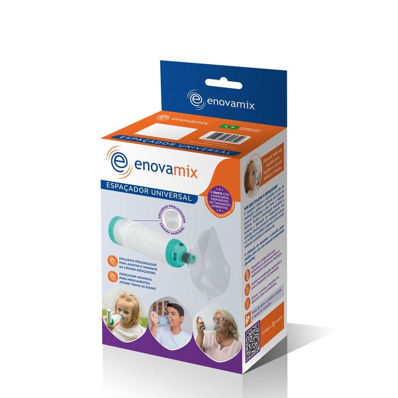 O Espaçador Enovamix Universal é um dispositivo médico utilizado principalmente para administrar medicamentos inalatórios, como broncodilatadores e corticosteroides, de forma mais eficaz em pacientes com doenças respiratórias, como asma ou doença pulmonar obstrutiva crônica (DPOC). Ele é utilizado principalmente com aerossóis dosimetrados (também conhecidos como 'sprays' ou 'bombinhas') e ajuda a melhorar a deposição do medicamento nos pulmões, aumentando assim a eficácia do tratamento.