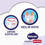 Informações de segurança Atenção: Para um uso seguro e eficaz, verifique se a fralda está adequadamente ajustada à cintura do bebê, evitando o contato direto com a pele e a possibilidade de escape de conteúdo. Além disso, garanta que a fralda usada seja descartada corretamente para evitar riscos de contaminação ou lesões. As fraldas Babysec possuem laterais elásticas com indicadores de umidade e sistema abre fácil, garantindo o melhor ajuste, conforto e proteção ao bebê. Além disso, possuem gel ultra absorvente e barreiras reforçadas, garantindo rápida absorção dos líquidos, mantendo a pele do bebê seca por mais tempo. As fraldas Babysec possuem cobertura com toque suave e decorada com vários desenhos divertidos.