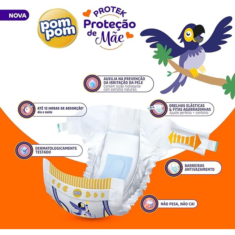 Prevenção de Assaduras: A tecnologia Derma Protek protege a pele sensível do bebê, ajudando a prevenir irritações e assaduras.