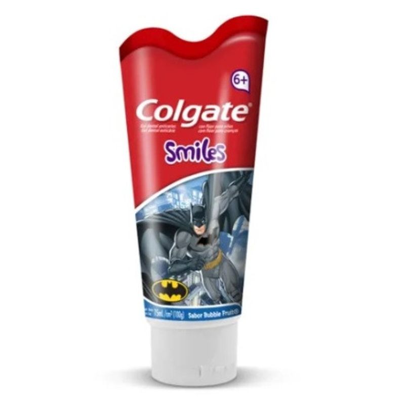 Creme Dental Colgate Smiles Batman & Mulher Maravilha agrada e incentiva a escovação diária e auxilia no combate à cáries e placas bacterianas. Com tampa de abertura rápida e fácil de usar.