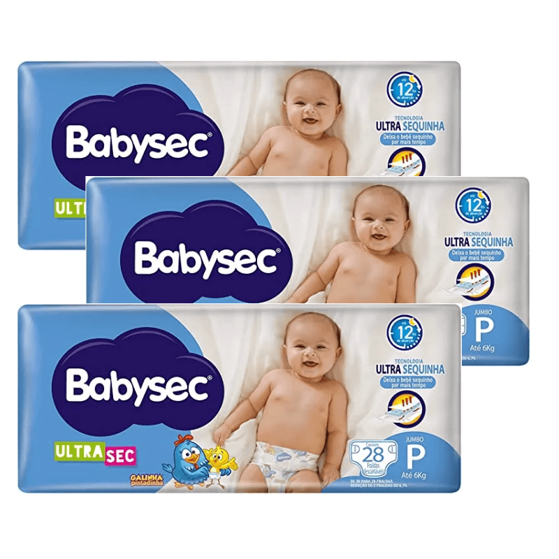 3 Fraldas Babysec Ultrasec Jumbo Galinha Pintadinha P com 28 unidades cada.