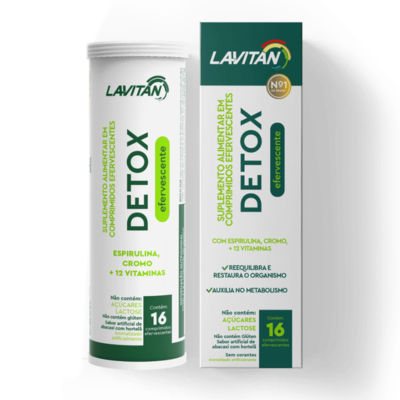 O Lavitan Detox é o primeiro multivitamínico Detox efervescente do Brasil! Cada comprimido possui 12 vitaminas e dois ingredientes especiais: Cromo, que auxilia na aceleração do metabolismo e a Espirulina, que é uma microalga que possui alta concentração de minerais, vitaminas, proteínas, carotenoides e compostos antioxidantes importantes. Também é considerada um superfood rica em clorofila que ajuda a remover as toxinas da corrente sanguínea enquanto reequilibra e restaura o organismo.