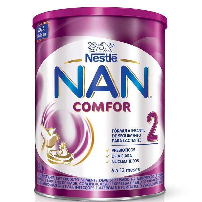 NAN Comfor 2 é uma fórmula infantil para lactentes, desenvolvido pela Nestlé que contém prebióticos, DHA, ARA e Nucleotídeos. Apresenta baixo teor de sódio, além de ser sem açúcar, glúten e aromatizantes. Seu uso é indicado para suprir as necessidades nutricionais de lactentes de 6 a 12 meses. Possui um mix de gorduras que inclui os ácidos graxos essenciais, além de vitaminas e minerais.