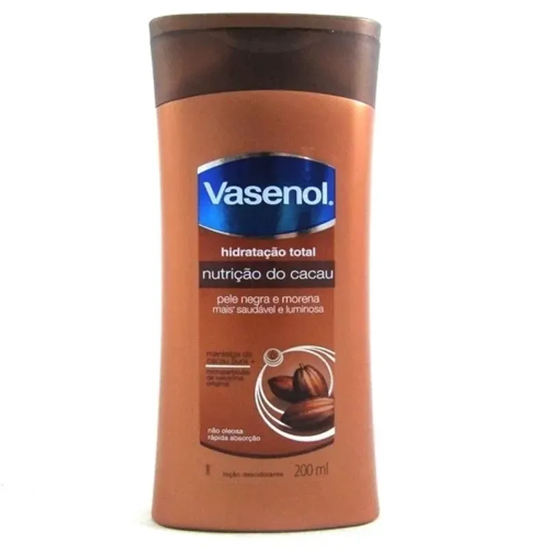 A Loção Hidratante Vasenol Nutrição De Cacau, por possuir 3x mais ativos de hidratação que sua antiga formulação, a linha Vasenol Hidratação Total garante resultados mais rápidos e duradouros para sua pele, pois contém micropartículas de vaselina original que proporcionam um aspecto mais saudável e luminoso, sem deixar sua pele oleosa. Com uma deliciosa fragrância gourmet, obtida através dos nutrientes da manteiga de cacau, deixa a pele levemente perfumada. - Sobre a Vasenol: Acreditamos que pele saudável precisa de um cuidado profundo. Em 1870, descobrimos a vaselina e colocamos o poder de cura da vaselina em tudo que fazemos. Assim cada um de nossos produtos é projetado para tratar a pele além da superfície deixando-a mais saudável a cada dia. Vasenol está presente em mais de 60 países, e no Brasil desde 1975. Em 2013 lança duas novas linhas, que vão deixar sua pele bonita e hidratada. Que recupera profundamente a pele seca por até 3 semanas. Sua nova formulação combina ingredientes de cacau e aveia com o benefício das micropartículas de vaselina original, hidratando profundamente a pele, sem deixar sensação oleosa.