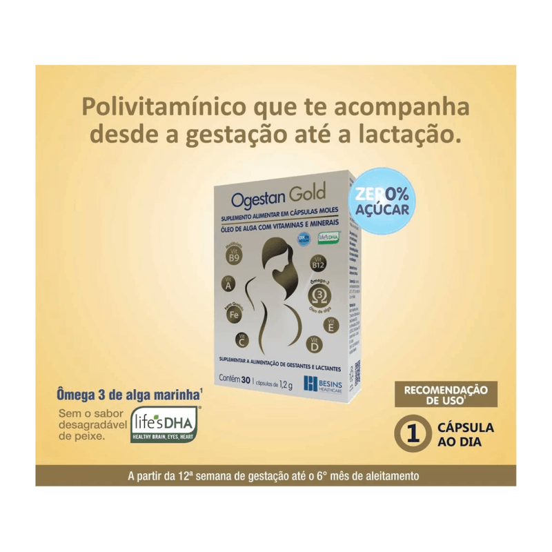 Ogestan Gold é um suplemento alimentar em cápsulas composto por óleo de alga, vitaminas e minerais, em concentrações adequadas às necessidades do organismo, conforme a ingestão diária recomendada. Sua fórmula contém ômega 3 de alga marinha, vitamina D, metilfolato, bisglicinato ferroso, além de outras vitaminas e minerais.