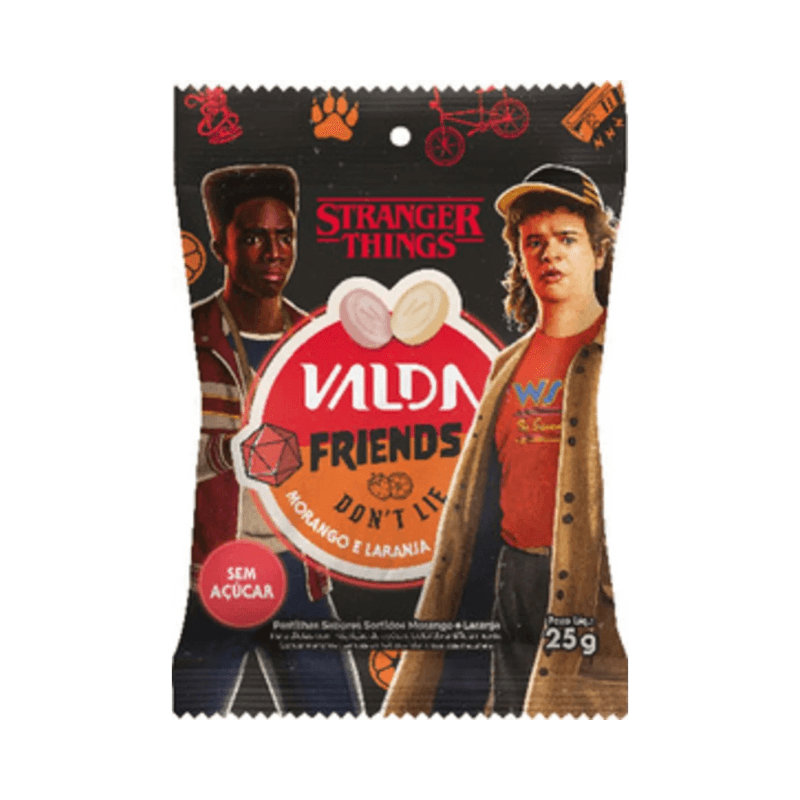 Ingredientes Bala Valda Friends Morango e Laranja Stranger Things 25g: