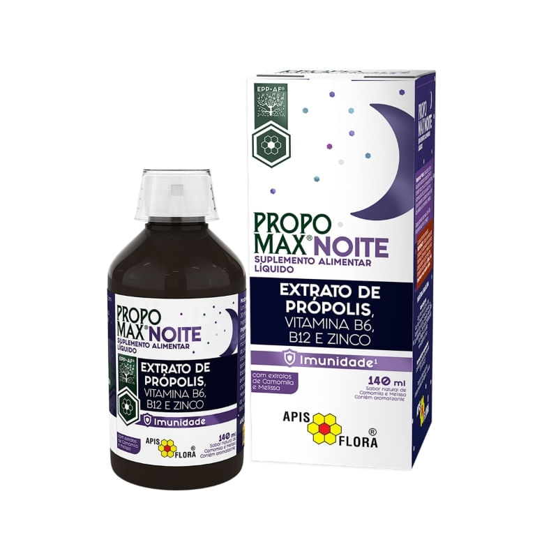 Propomax® Noite foi elaborado especialmente para oferecer um excelente produto, que combina o exclusivo extrato de própolis EPP-AF®com zinco e as vitaminas B6 e B12, que auxiliam no funcionamento do sistema imune, além de ter, em sua fórmula, extratos de camomila e melissa. Propomax® Noite ainda conta com a praticidade de já vir pronto para uso.