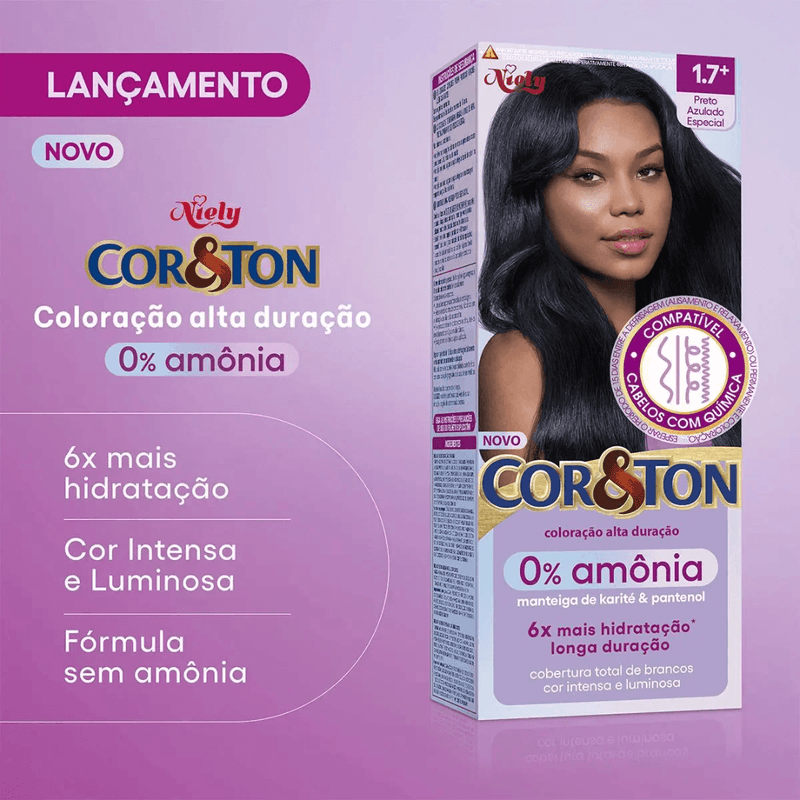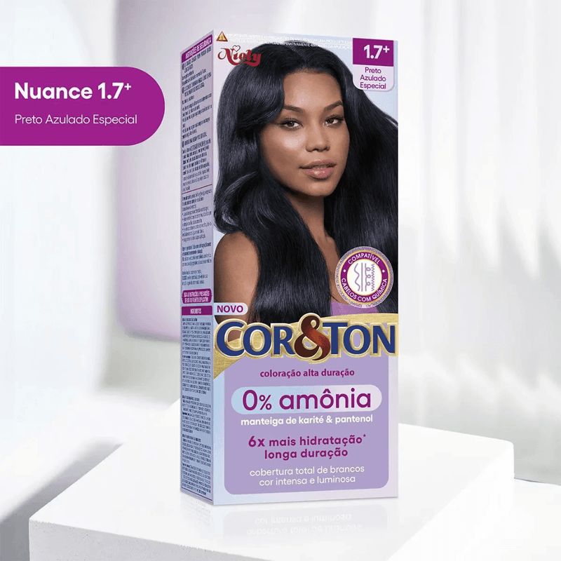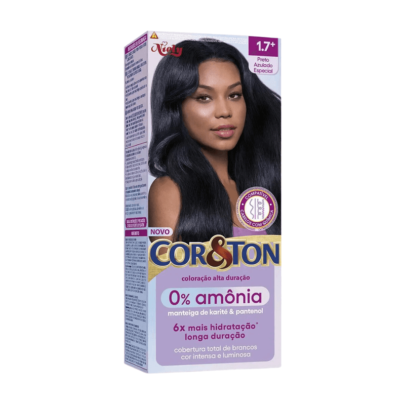 A Tintura Cor&Ton Niely 0% Amônia 1.7 Preto Azulado é indicada para colorir os cabelos, cobrindo fios brancos e proporcionando um tom preto azulado intenso, com cuidado especial para os fios.