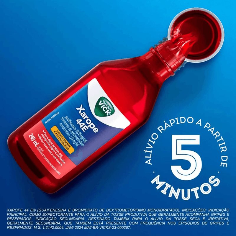 O Vick 44E Xarope Expectorante 240ml é um medicamento indicado para o alívio da tosse e das secreções respiratórias, proporcionando uma ação expectorante que facilita a eliminação do muco. Sua fórmula eficaz ajuda a desobstruir as vias respiratórias, proporcionando alívio rápido e confortável para quem sofre com tosse produtiva e congestionamento.