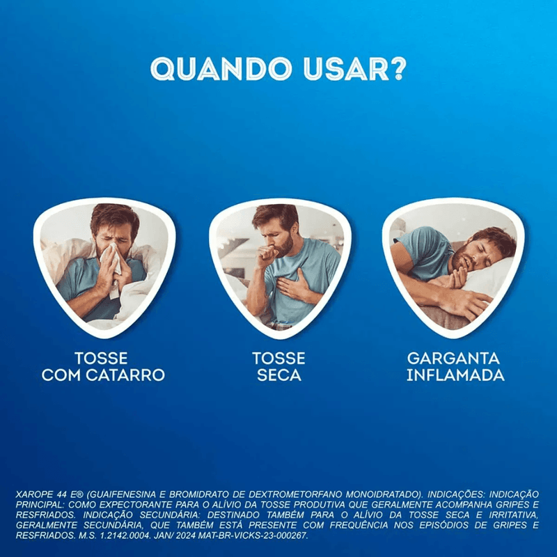 O Vick 44E Xarope Expectorante é indicado para o tratamento de tosse com excesso de secreção, facilitando a expectoração e aliviando os sintomas de congestão. Ideal para resfriados, gripes e outras condições respiratórias que causam acúmulo de muco.